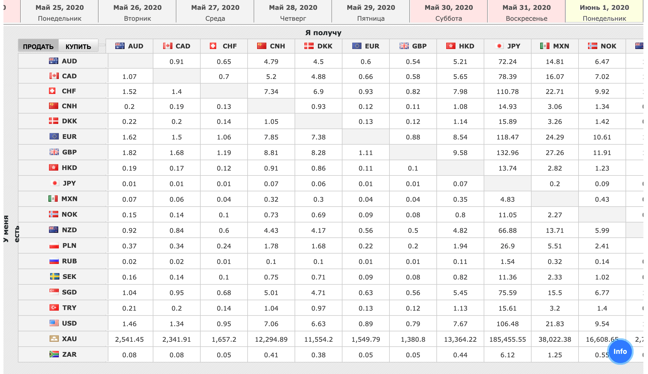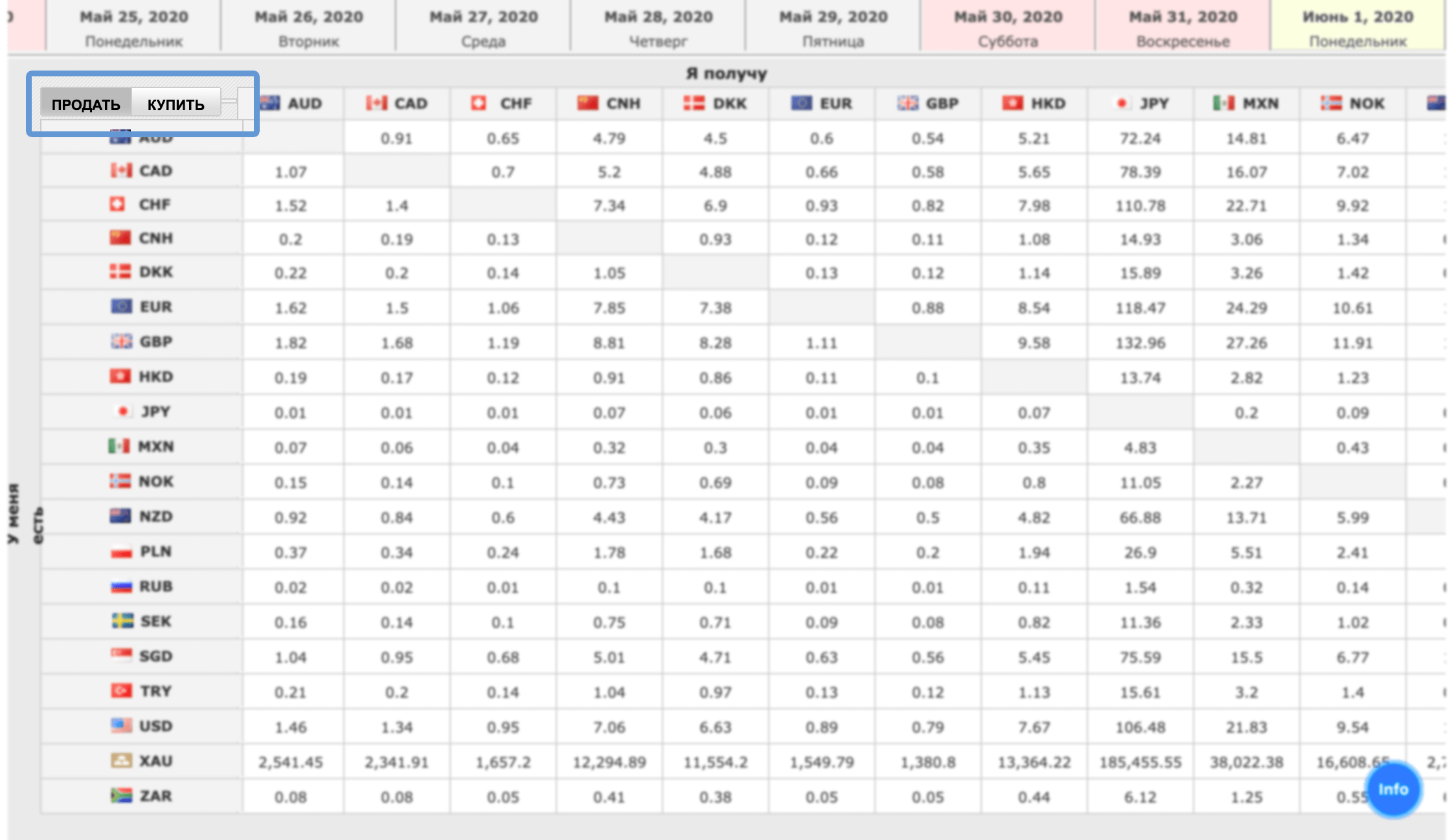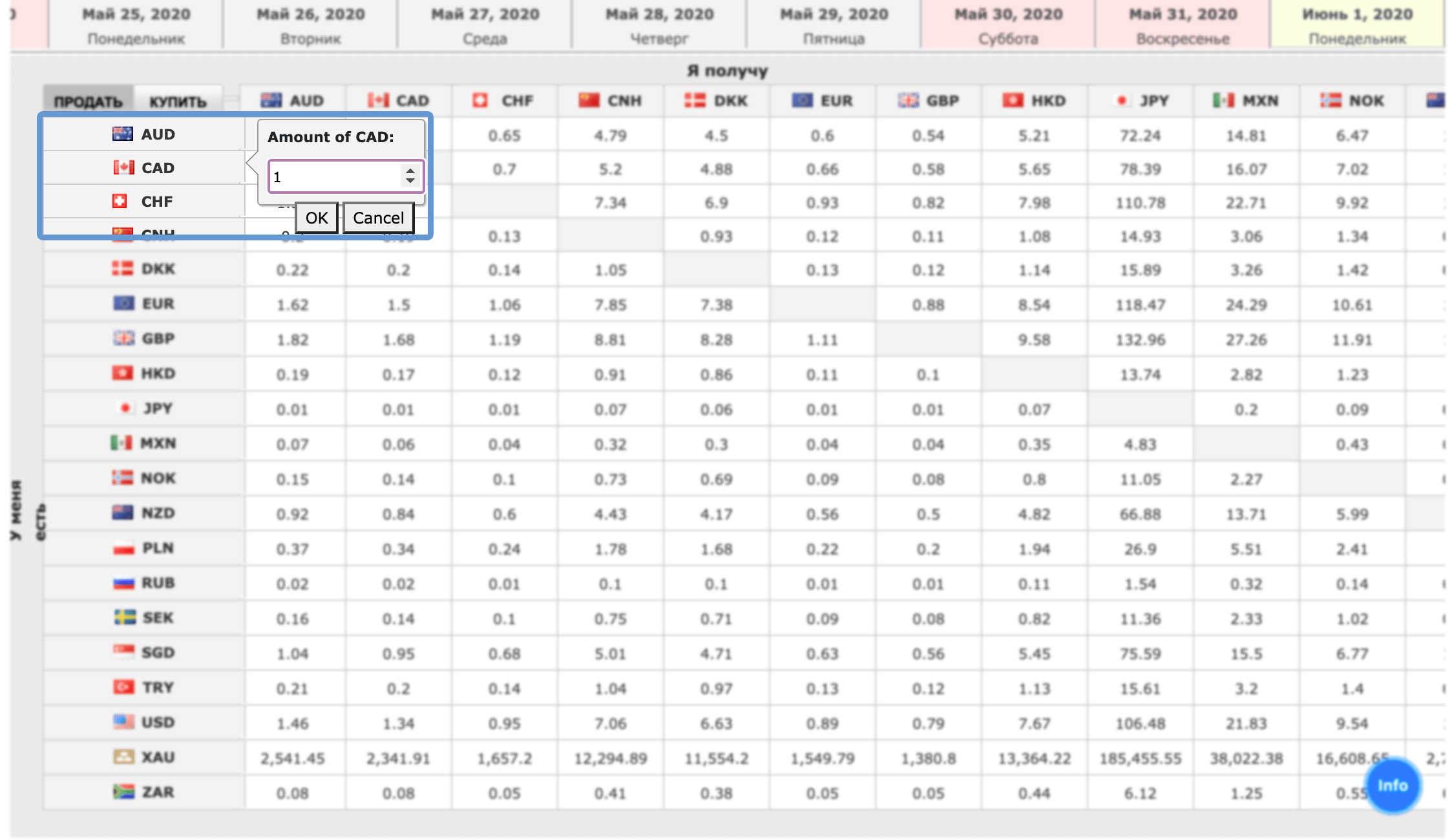 При нажатии открывается окно с валютой на покупку или продажу