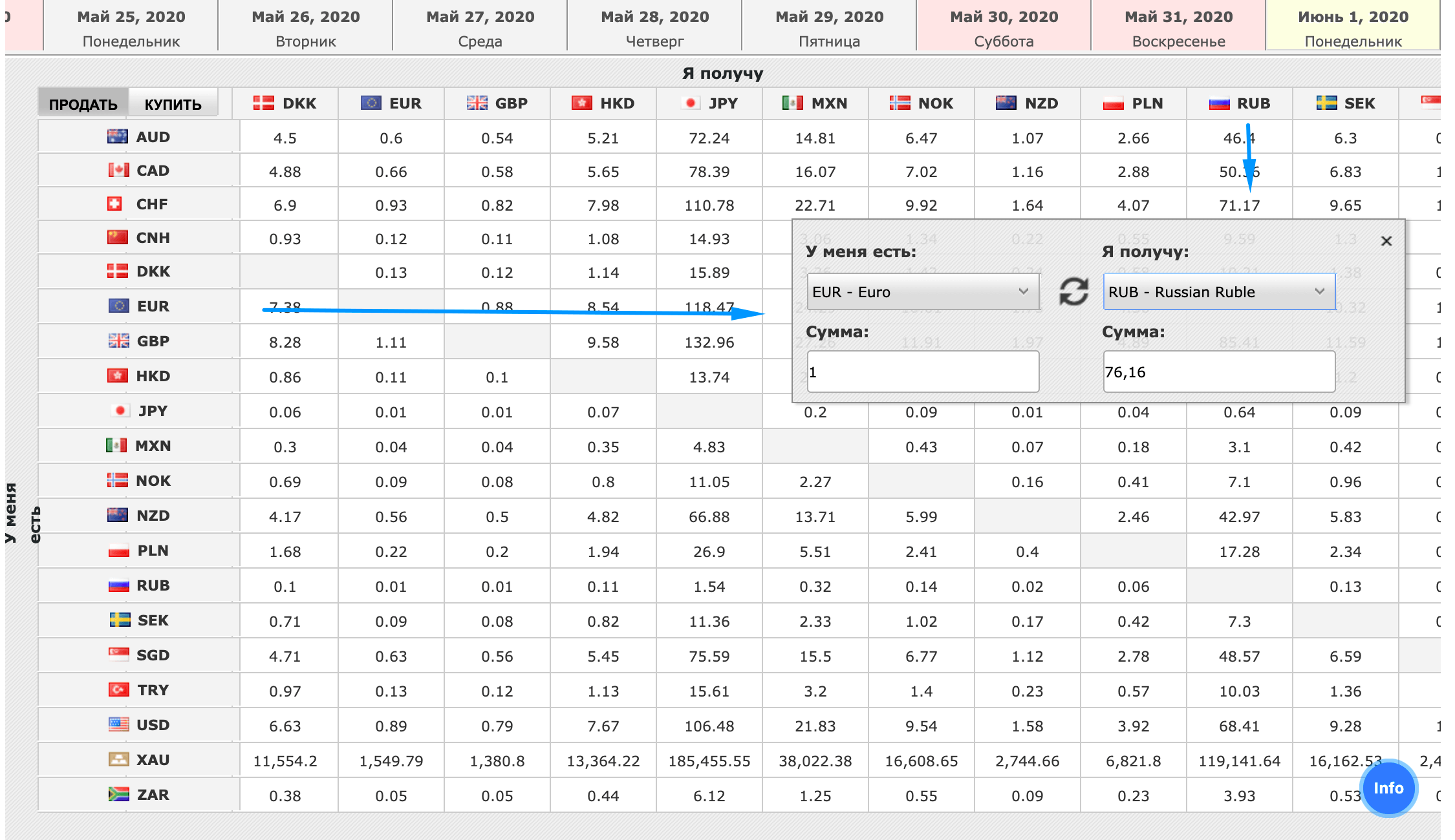 Меняем евро на рубли. Ищем евро в вертикальном столбике, рубль в горизонтальном. Кликаем на получившийся курс, после чего открывается окно: