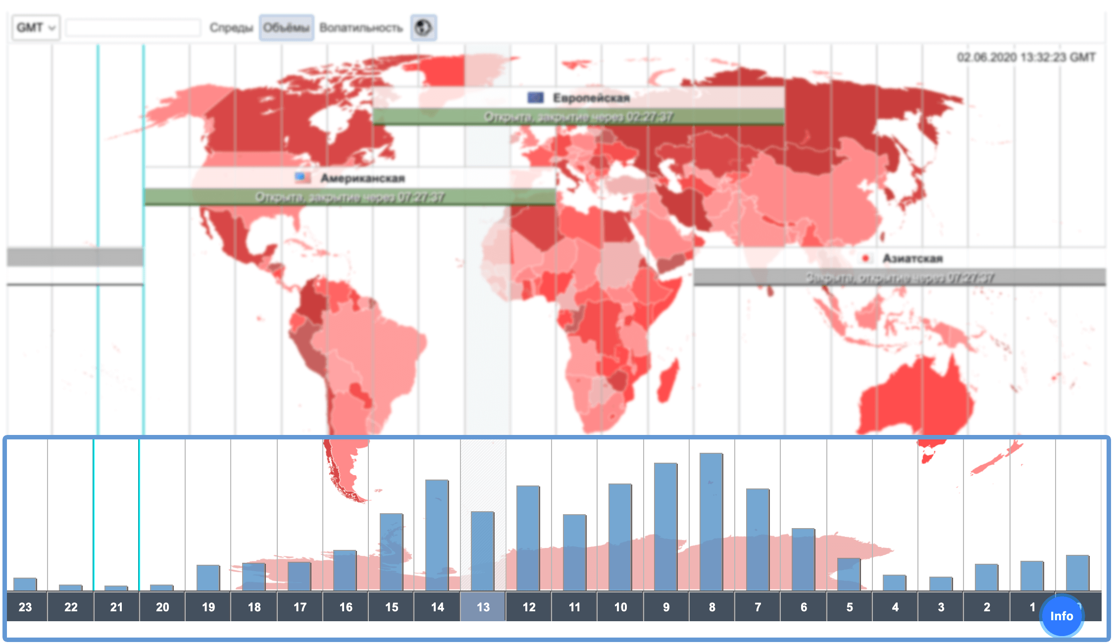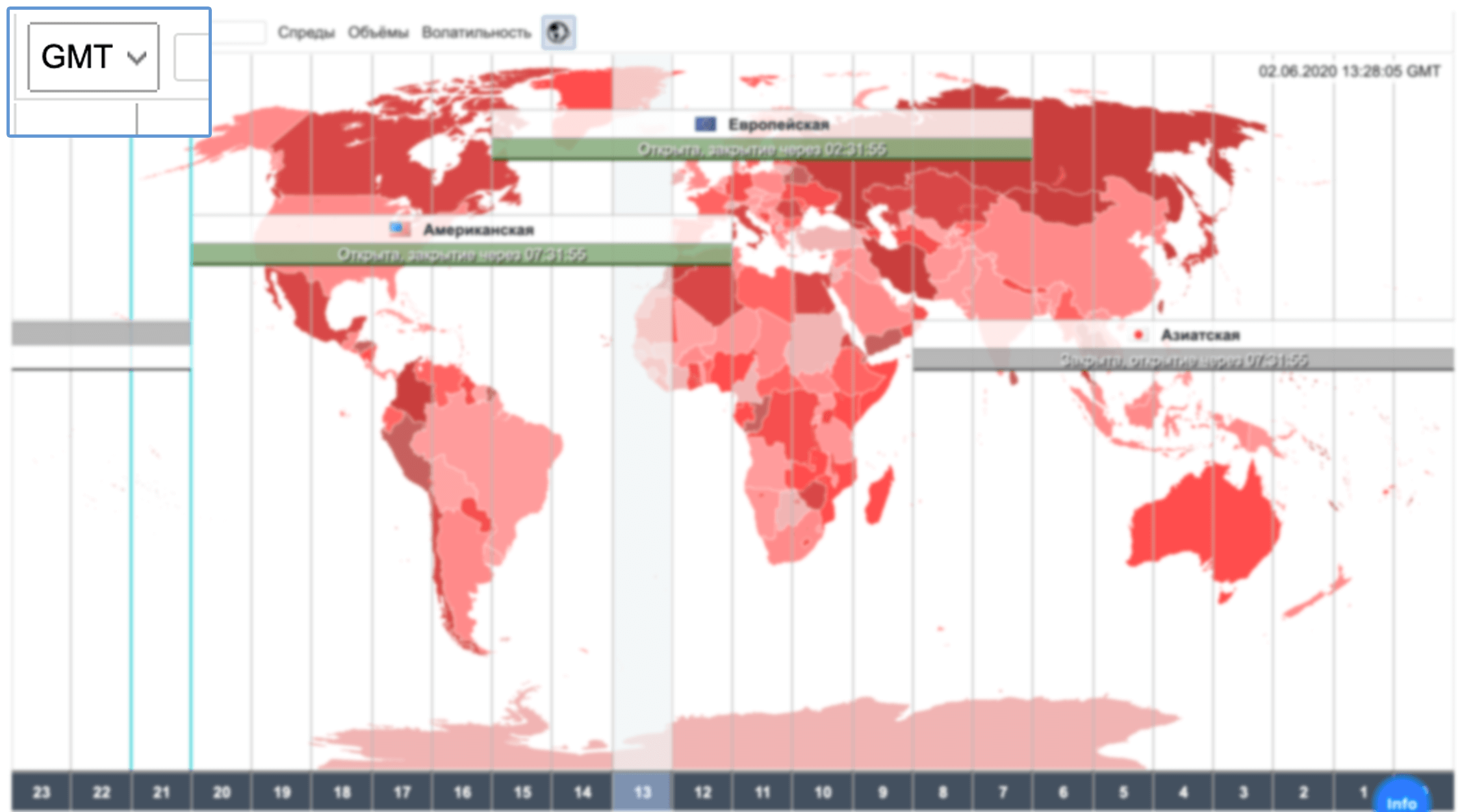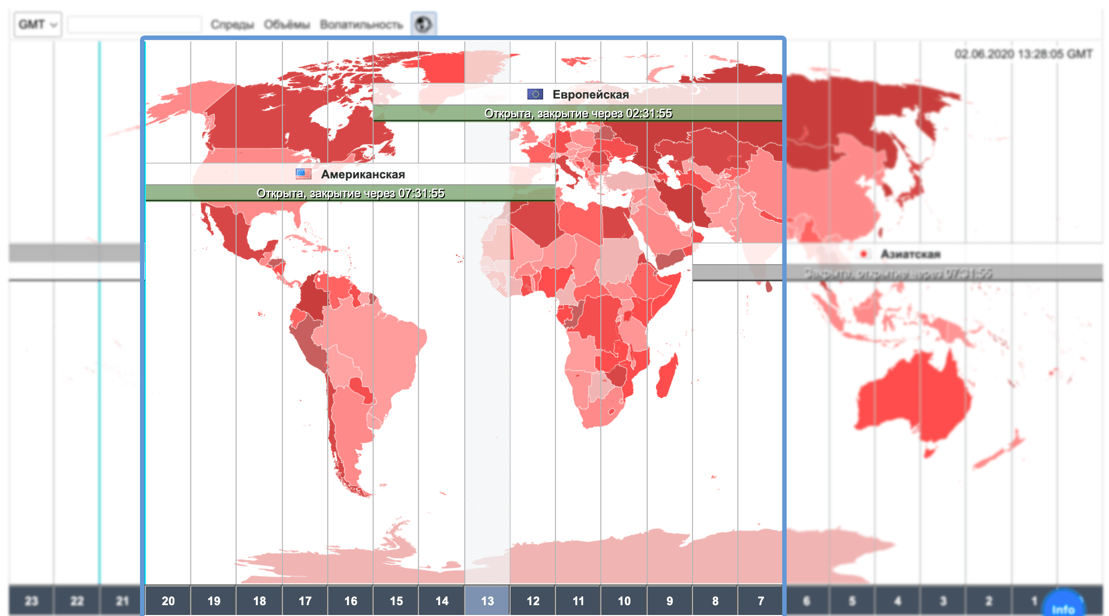 Карта разделена на торговые сессии, возле каждой из них есть время открытия/закрытия. Внизу есть разделение по часам. В правом верхнем углу указаны текущие время и дата.
