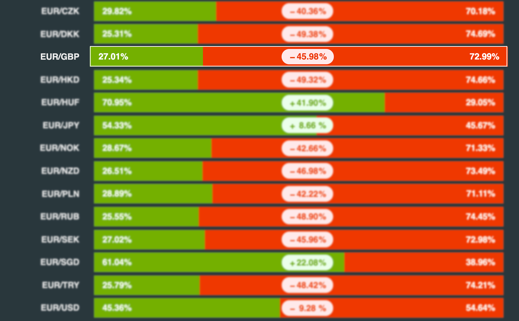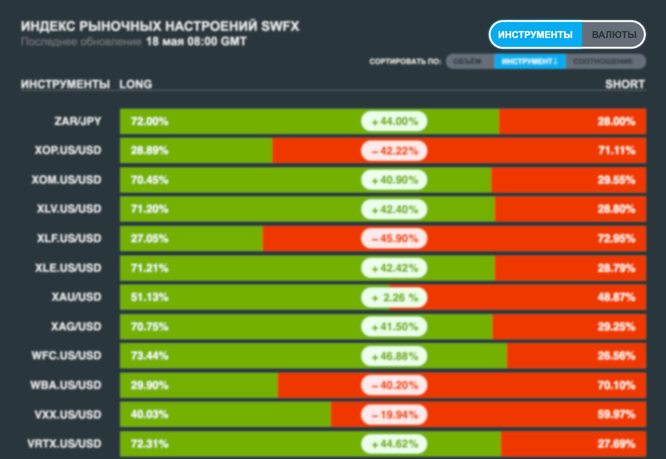 Отличие этого виджета от других подобных в том, что тут отображается сантимент не только по валютам, а по широкому списку активов: акции, товары, металлы, индексы, фьючерсы.