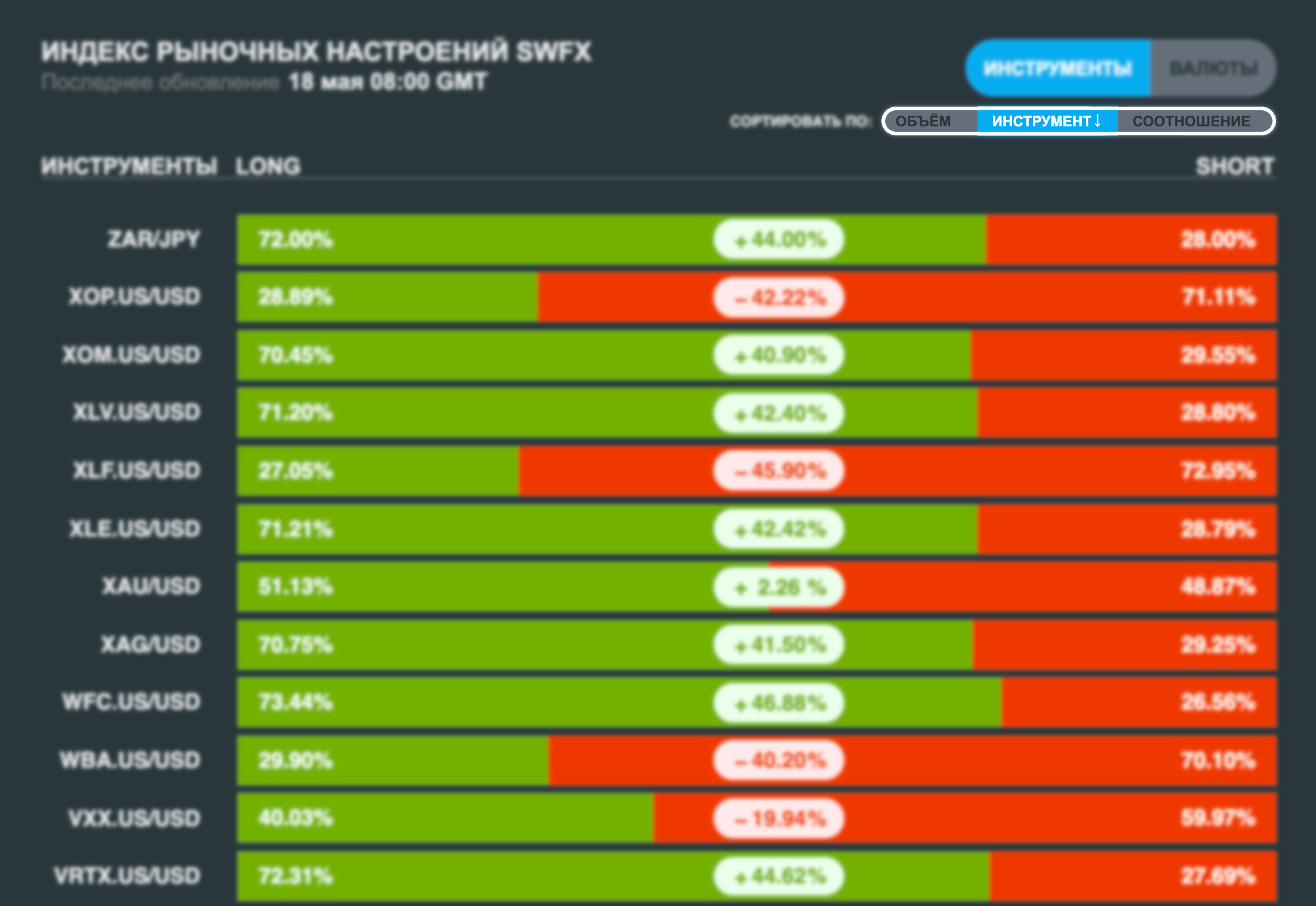 Ниже есть фильтры по объему инвестированных средств, инструменты в алфавитном порядке и соотношение, сортируемые по величине разницы коротких и длинных позиций.