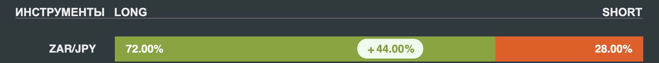 Левая часть зеленого цвета – это процент длинных позиций, а правая красная отображает короткие. По центру находиться величина отклонения (long-short)
